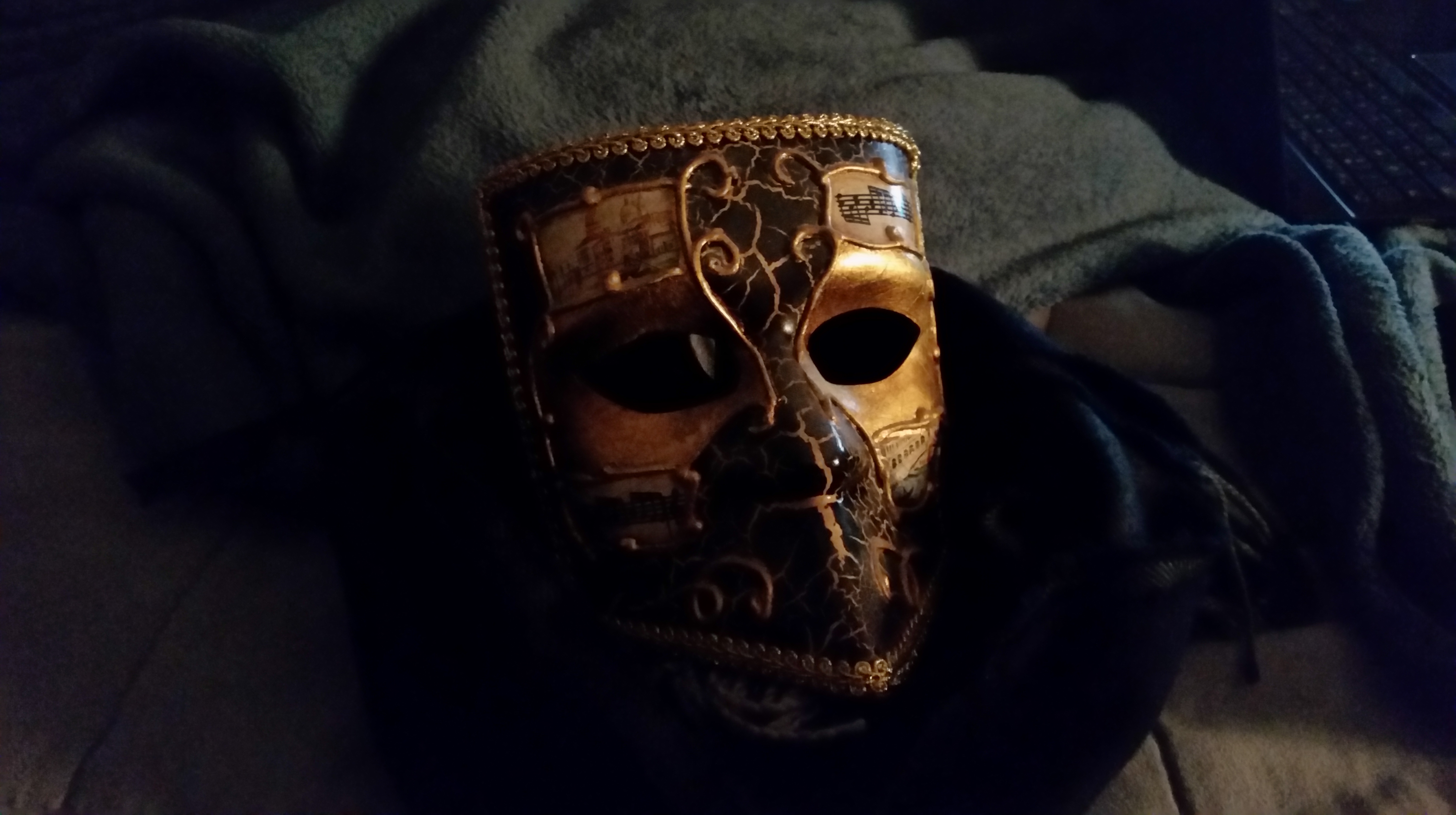 Kallie stares at her, an ornate, black-and-gold mask on her face. There is no strap, no stick to hold it up with as the Venetians used to use. Her face is fully covered by the construct. The triangular shape of the chin juts out and the mask breaks off at the sides, rimmed in bright gold. Green eyes stare out from the holes shaped into the respective spots, a slight glow to them. Allie is frightened, as Kallie’s eyes are grey. The red-gold hair remains, framing the mask in fire. The smaller girl does not speak.