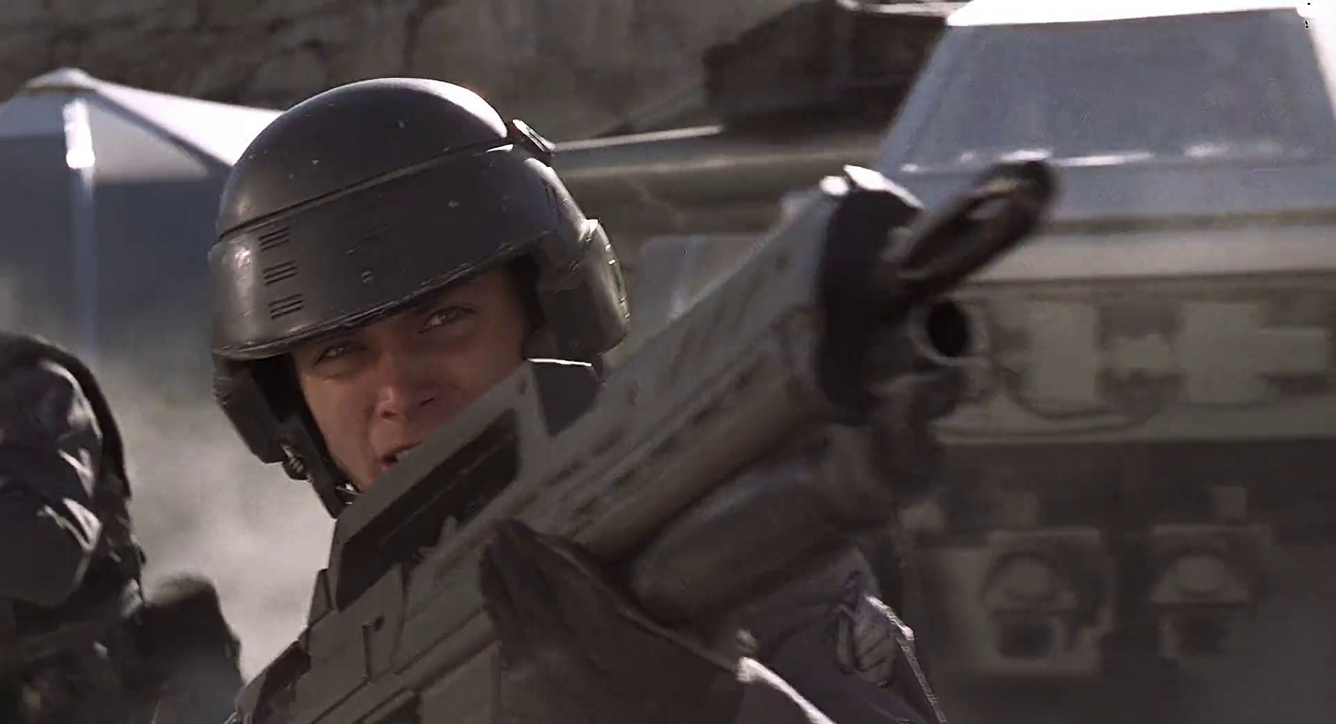 And let’s talk about the enemies, deemed “bugs” in the script. The characters know nothing about them other than the Federation wants their territory and the bugs don’t like that. They’re taught to hate them even as they’re told to be cautious. It’s dehumanizing, reminiscent of the way the Nazis talked about Jews and the way I’ve heard more modern political entities describe societies outside the idea of American Exceptionalism. We have starships, all this new wireless technology, and high powered weaponry, all only good for killing bugs as the Earth unites to simply wipe out anything that isn’t what its citizens are told is acceptable. There are small hints throughout the film that suggest Earth has encroached on the bugs’ territory, hostilities only in full sway because we decided we wanted what they had. The final, triumphant moment involves capturing one of the bug leaders and, in a moment that makes my skin crawl, the Federation soldiers gleefully cheer at the simple fact that the bug is afraid. Hell, a Fox News-esque television commentator screams over a guest (supposedly brought on for an opposing opinion) that the idea of an intelligent bug is offensive.