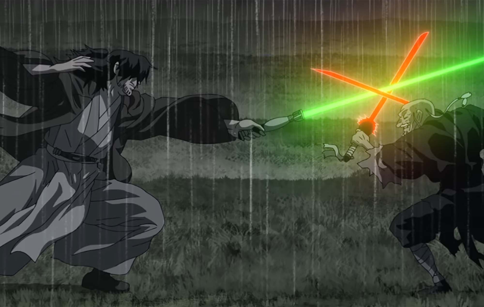 A lot of it centers around the Jedi and Sith conflict, specifically the connection they have with both Kyber Crystals (the juice that makes their lightsabers special) and The Force. This is where some of the stories begin to have mixed results, as it’s the most overblown aspect of the franchise’s legacy while also remaining the one that would lend itself to best to the anime format. Star Wars is historically a ripoff of feudal-set Japanese films, taking the stories of samurai and the royal caste to tell stories of boots-to-the-ground individuals navigating those spheres; it creates a Japanese iconography with a lily-white cast in its mere existence. Bringing it to anime studios has allowed these historical, feudal stories to take root in their most primordial form. Lightsabers look like katana, old Sith masters look like sinister caricatures, and the the visuals wouldn’t feel out of the realm of possibility in series like Cowboy Bebop or Inuyasha.