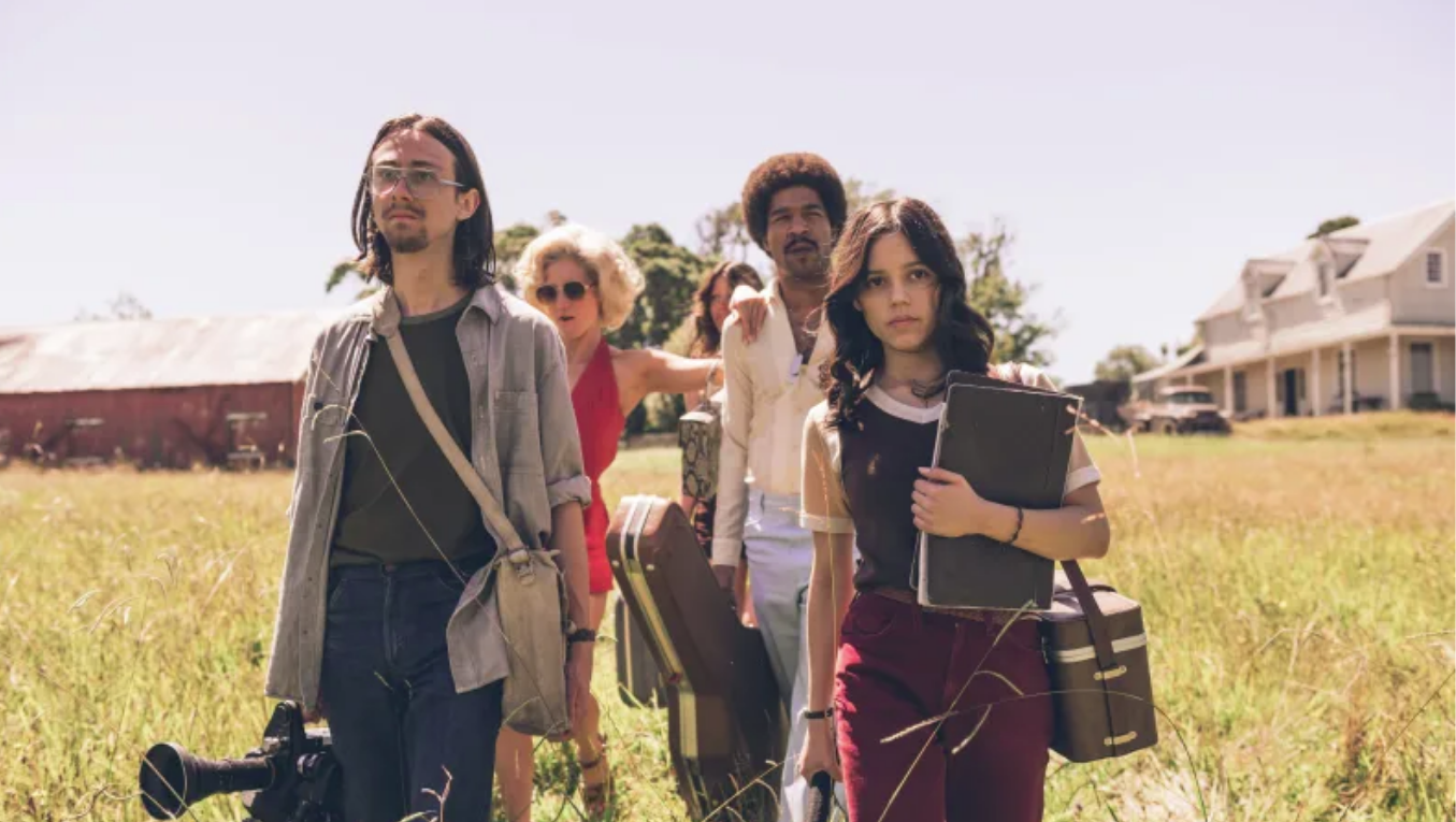 We start with a blood-covered ax embedded in a wooden porch, blood and bodies everywhere as the police try to figure out exactly what happened, but we’re immediately transported 24 hours into the past as Maxine Minx (Mia Goth) snorts cocaine in the back of the strip club owned by her boyfriend, Wayne (Martin Henderson). The two are embarking on a trip from Houston to a cabin for rent in the middle of nowhere, all so they can shoot a skin flick with co-stars Bobby-Lynne (Brittany Snow) and Jackson Hole (Kid Cudi). They’ve brought along film student RJ Nichols (Owen Campbell) and his girlfriend/assistant, Lorraine (Jenna Ortega). The crew arrives and discovers that Wayne hasn’t told the owners of the cabin, Pearl and Howard, what will be happening. Death follows and hilarity ensues.