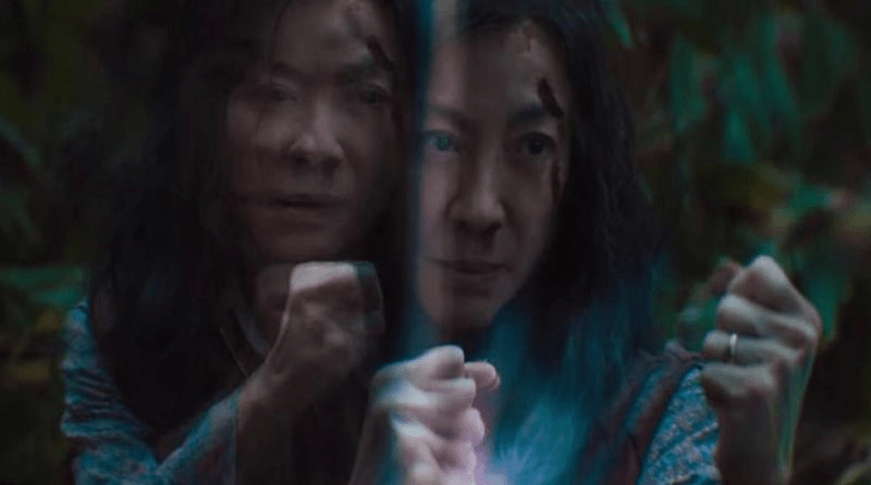 Evelyn (Michelle Yeoh) is dealing with a lot. Her failing coin-op laundromat business is a thorn in her side, her husband Waymond (Ke Huy Quan) is asking for a divorce, her father Gong Gong (James Hong) is still disappointed in every one of her life choices, and her lesbian daughter Joy (Stephanie Hsu) is suffering from a semi-truck full of anxiety as she tries to reconcile the warring love and hatred inside. As if all of that weren’t enough they’re being audited by the IRS, courtesy of award-winning auditor Dierdre (Jamie Lee Curtis). Add in the fact that Evelyn is apparently the savior of the multiverse? Perhaps BECAUSE her life is a series of failures? And she has to save it from an evil being named Jobu Tupaki that looks an awful lot like her daughter in the greatest costumes this side of Lady Gaga? You can see why she’s so irritable.