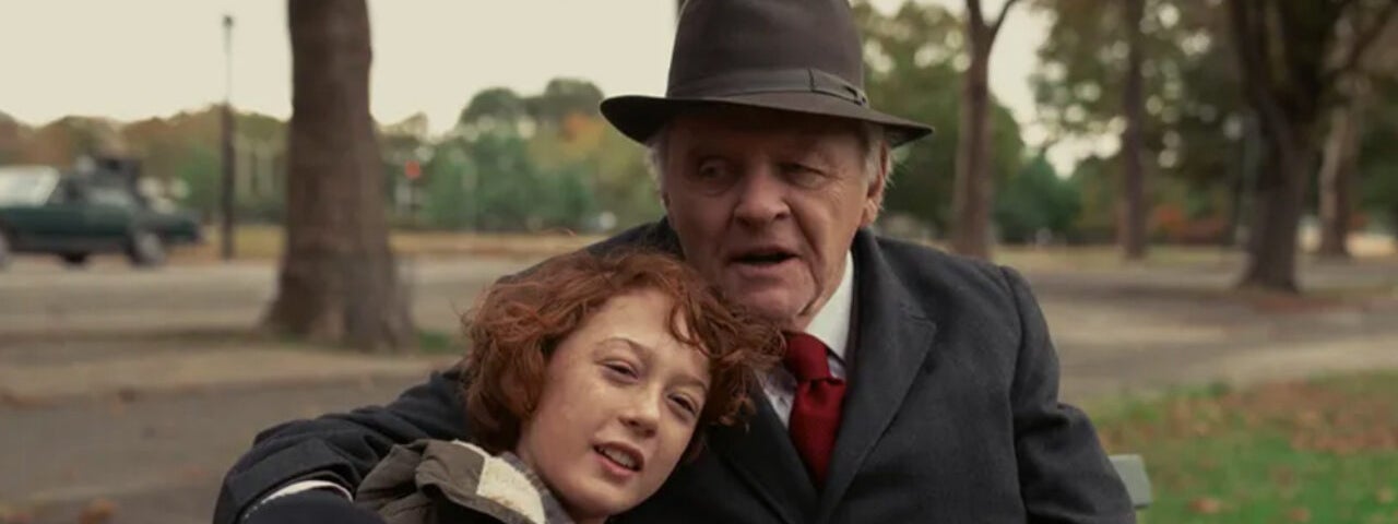 Paul Graff (Banks Repeta) is a typical movie kid in many ways. He’s artsy, which confuses his teachers and makes them feel uncomfortable. He’s intelligent but unfocused, which makes them frustrated and unwilling to deal with him.He’s Jewish, and that’s an issue in and of itself to many in his world. He’d get a lot more flack if it weren’t for Johnny (Jaylin Webb), the only black kid in his class, and the fact that all misdeeds that aren’t directly witnessed are blamed on the other boy. Johnny has a brother-in-law that works for N.A.S.A. in some capacity, living down south and sending the young boy memorabilia that enthralls Paul as well. Johnny’s life begins to unravel when he and Paul are caught smoking weed in the bathroom, something neither really understood but they thought they’d try anyway. As Johnny’s situation worsens Paul’s gets more complicated, with his father Irving (Jeremy Strong) and mother Esther (Anne Hathaway) sending him to a private school to get him away. Aaron Rabinowitz (Anthony Hopkins), Paul’s awesome grandpa, is perhaps the only one that can get through to him. Strap in because you’re going to spend two hours watching this kid learn about different types of racism, prejudice, and hatred during the rise of Ronald Reagan in America and it’s not going to be pretty.