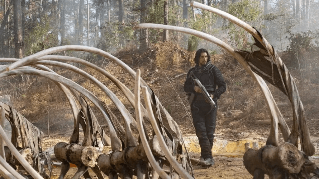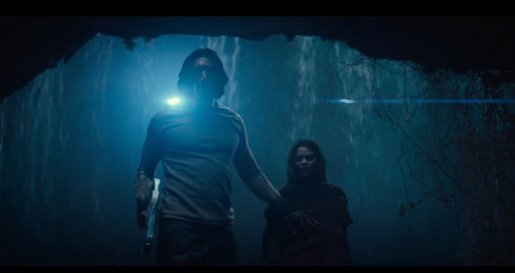 The title is indeed how many million years ago this takes place, revealed in the sweatiest title card of all time about thirty minutes into the movie. Mills (Adam Driver) is transporting some humans to a new world in cryosleep, interrupted by an uncharted asteroid field, and crashed onto our ancient world. He’s only there because his daughter (Chloe Coleman) needs a treatment the family cannot afford without a pay raise for longer missions, constantly watching the video messages she’s sent him with ritualistic habit. The only other survivor of the crash is Koa (Ariana Greenblatt), a girl from a different culture and who cannot communicate through the language barrier, and the two need to cross a valley littered with dangerous dinosaurs to reach the escape pod that landed on a nearby mountain.