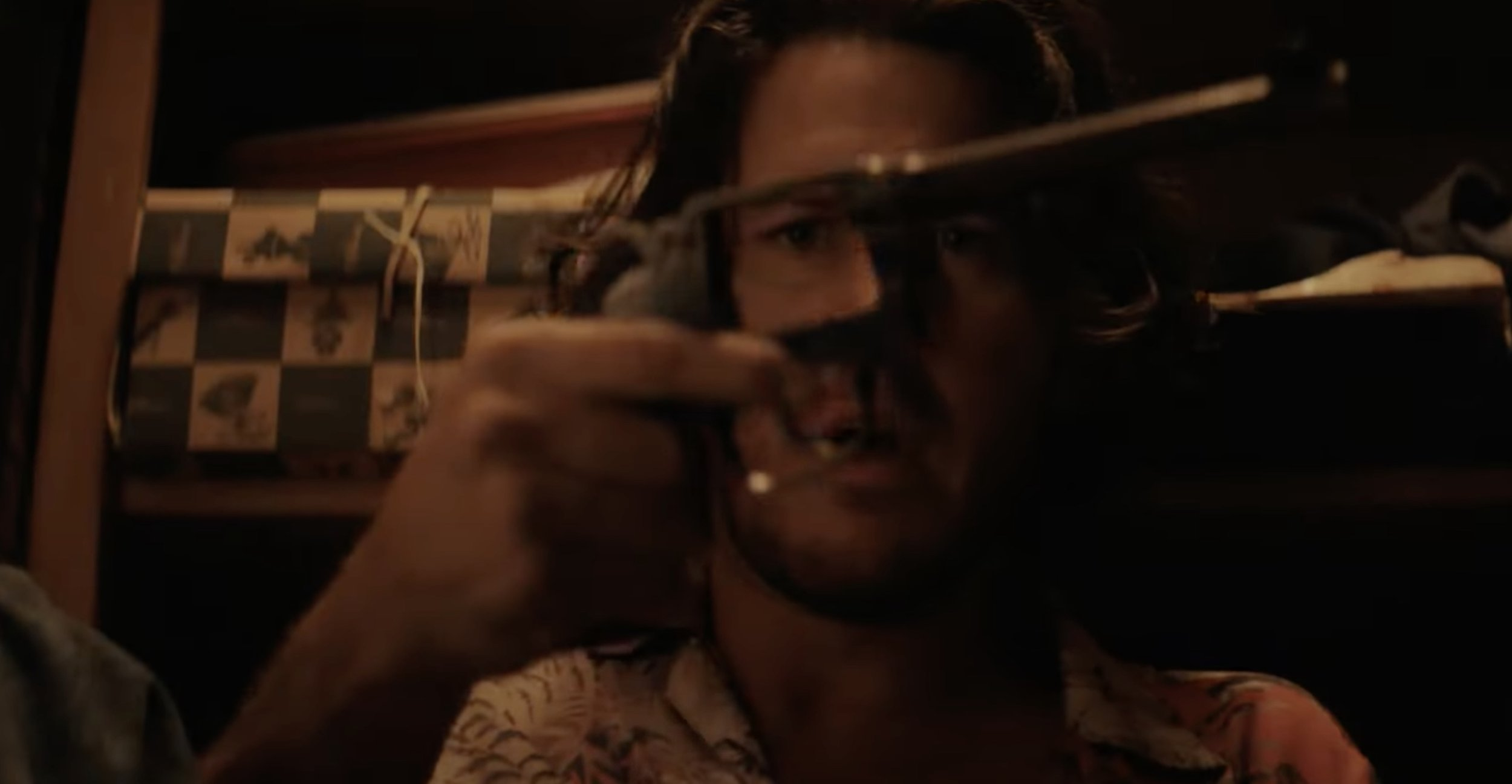 We open on Kat (Aaron Jakubenko) desperately trying to remember how many bullets are in his gun. It’s currently pressed to his head and he’s on his knees, sweating and desperately trying to figure out how to get out of his situation. We flashback to a mountain lion attack that results in Kat’s escape from a prison chain gang. One night and one cuck gag later he reunites with his brother, Sawyer (Ryan Kwanten), and his engaged ex, Jo (Melanie Zanetti). His night grows progressively worse as he makes several attempts to escape to Canada and live a quiet life away from the law.